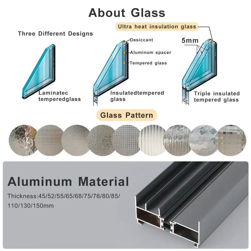 Notre porte est une isolation thermique, sonore, une décoration, une sécurité. Elle est fabriquée en verre double glaçage, en alliage de profilé d'aluminium et en kit dur d'excellente qualité, ce qui en fait une solution pratique pour les espaces de vie compacts et les petits espaces.